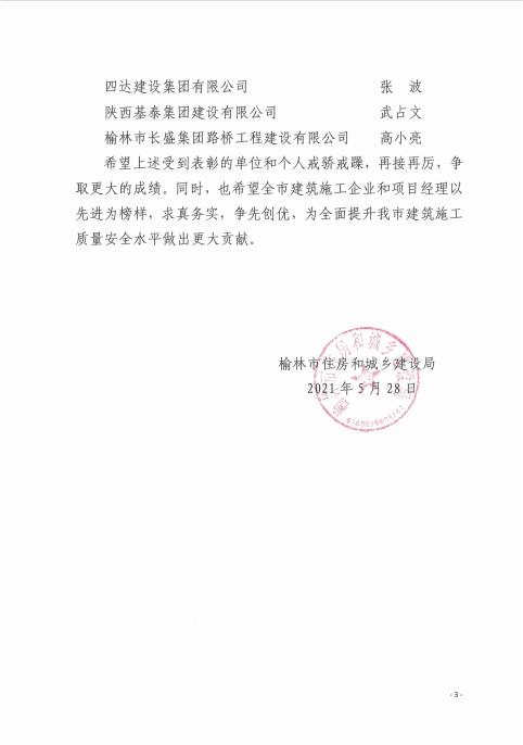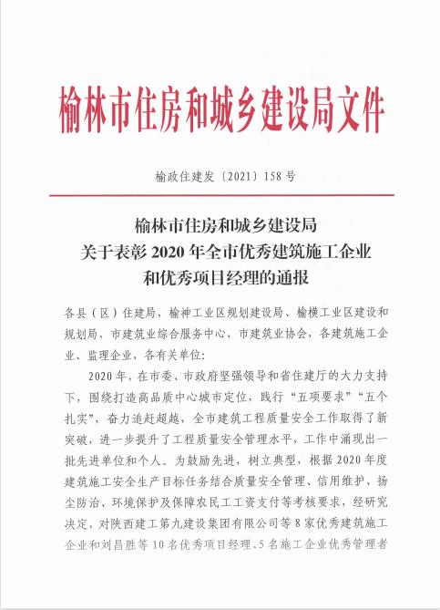 榆林市住房和城乡建设局关于表彰2020年全市优秀建筑施工企业和优秀项目经理的通报