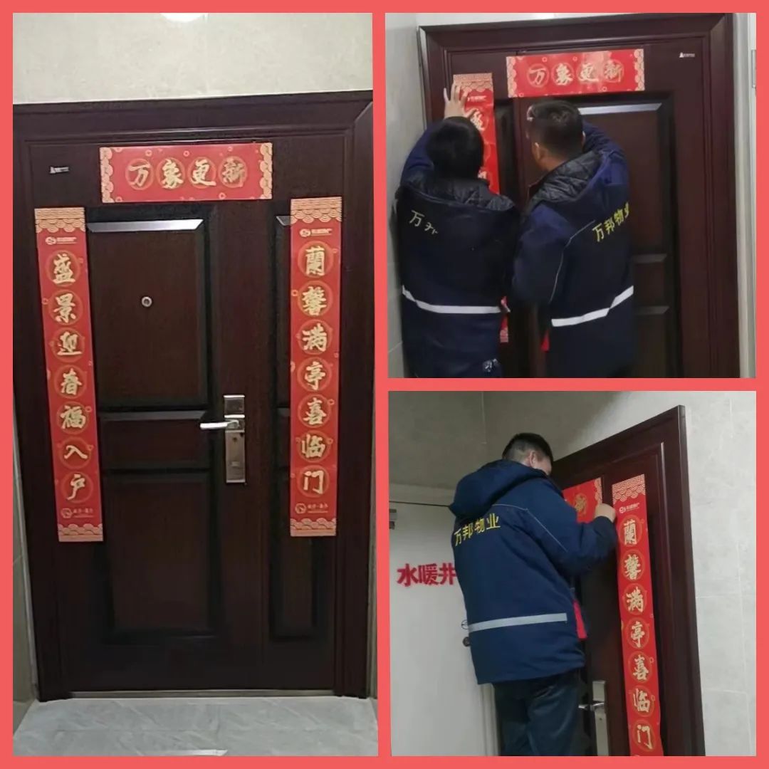 贴春联接福气|万邦物业-盛景蘭亭服务中心客服管家帮未入住户贴春联