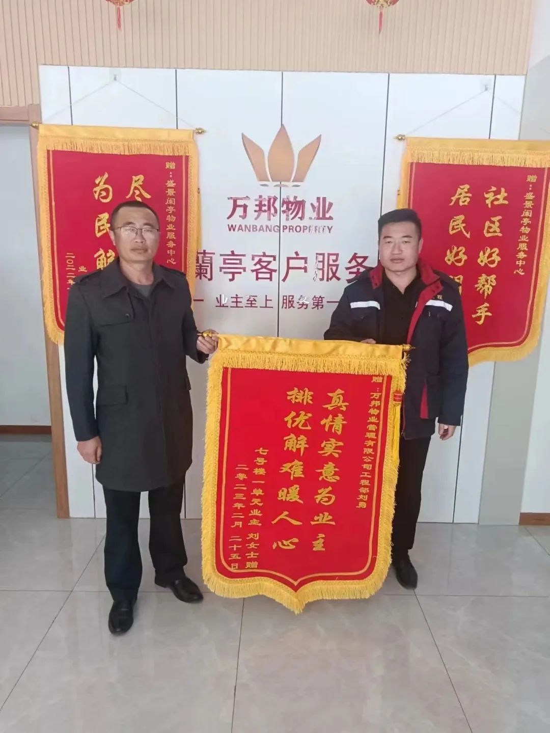 近日,万邦物业盛景蘭亭项目又迎来了一面鲜红的锦旗,绣着“排忧解难暖人心,真情实意为业主”的字样,送给了工程师傅刘勇,字里行间流露着业主的感激之情。