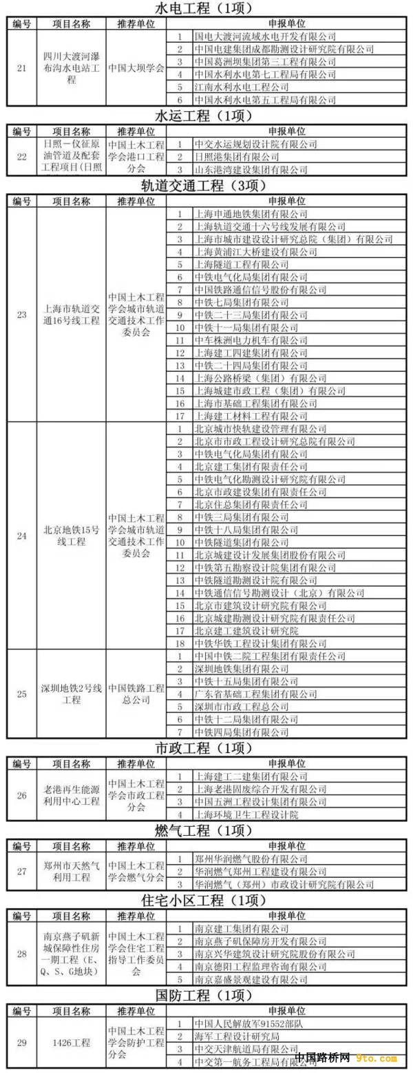 第十四届中国土木工程詹天佑奖总共有29项工程项目获奖,其中建筑工程9项,桥梁工程4项,铁道和隧道工程各2项,公路工程3项,水利水电和水运工程各1项,轨道交通工程3项,市政工程、燃气工程、住宅小区和国防工程各1项。