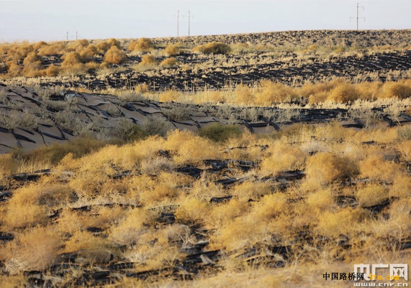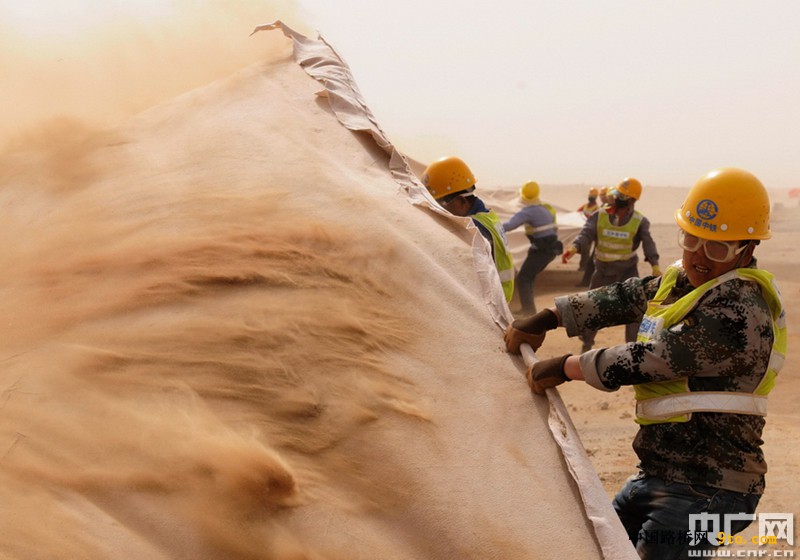 沙漠龙:在巴丹吉林沙漠,沙土每年平均移动速度大约有18米,如果不固定住移动沙丘,流沙很容易覆盖公路。固沙关键是一个个2米长、20公分宽的填充式黑色沙袋。这些沙袋呈田字形交叉叠放,然后形成一个个1平方米的小方格,连成一片。沙袋在设计很特别,是有鳍沙袋,编织袋边沿会留出3公分的穗儿,别小看这些穗,不单能减小风速,还能把吹起来的沙留在框格内。沙袋的面料采用的是耐寒耐晒材质,至少可以保持20年。第一项目部工程师王大伟说,根据风向,不同路段、不同方向铺设的沙袋群,宽度都有精确计算。