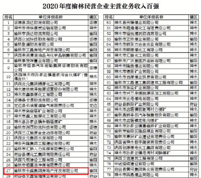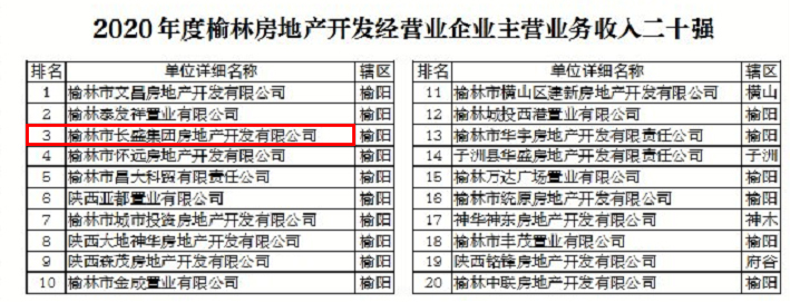 喜报|长盛地产、成建路桥荣登“榆林市2020年度‘五上’企业主营业务收入排行榜”