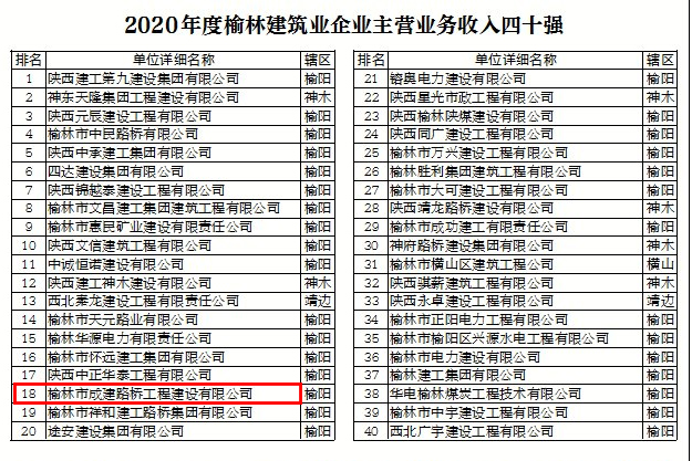 在公布的2020年度榆林建筑业企业主营业务收入四十强名单中,榆林市成建路桥建设有限公司排第18名。